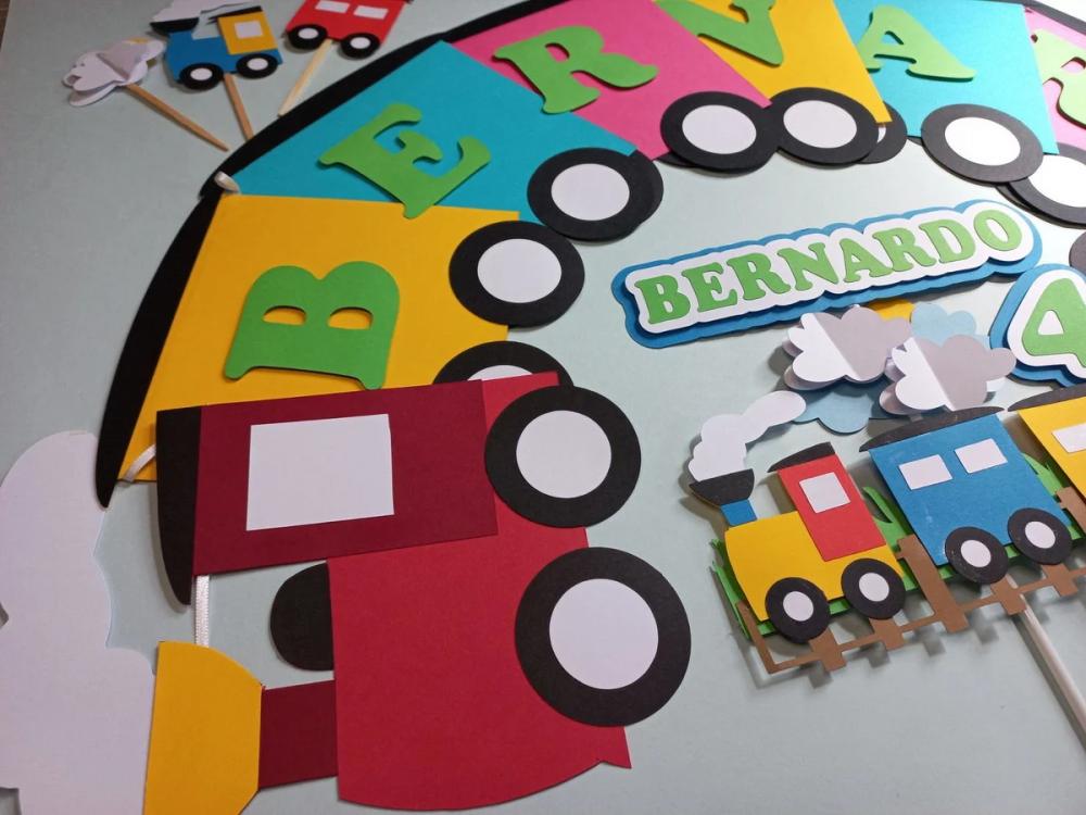 Kit de festa no tema trenzinho executado na técnica de camadas em papel de alta qualidade.