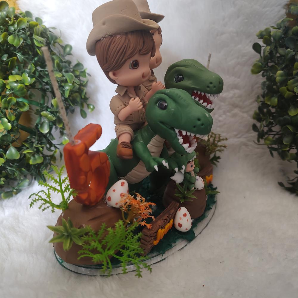 Encante seus filhos com esse topo de bolo dinossauro personalizado em biscuit para aniversário de irmãos. Produto artesanal e único.